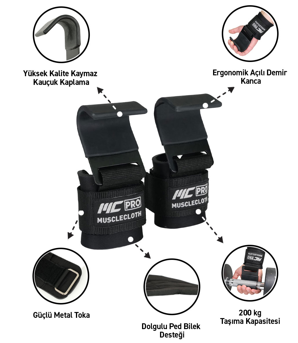 Bilek kancası; stresi, aşınmayı ve yıpranmayı azaltmak için çok güçlü bir kayışa, sağlam kancalara, güçlendirilmiş çapraz dikişlere ve ekstra kalın neopren malzemeye sahiptir. MuscleCloth Lifting Hooks, daha büyük ağırlıkları kaldırmanıza yardımcı olabilecek mükemmel kavrama ve güvenli bir kanca tutuşu sağlar. Kancaların yüzeyi, üstün bir tutuş sağlamanız için kaymaz dirençli kauçuk malzeme ile kaplanmıştır.
